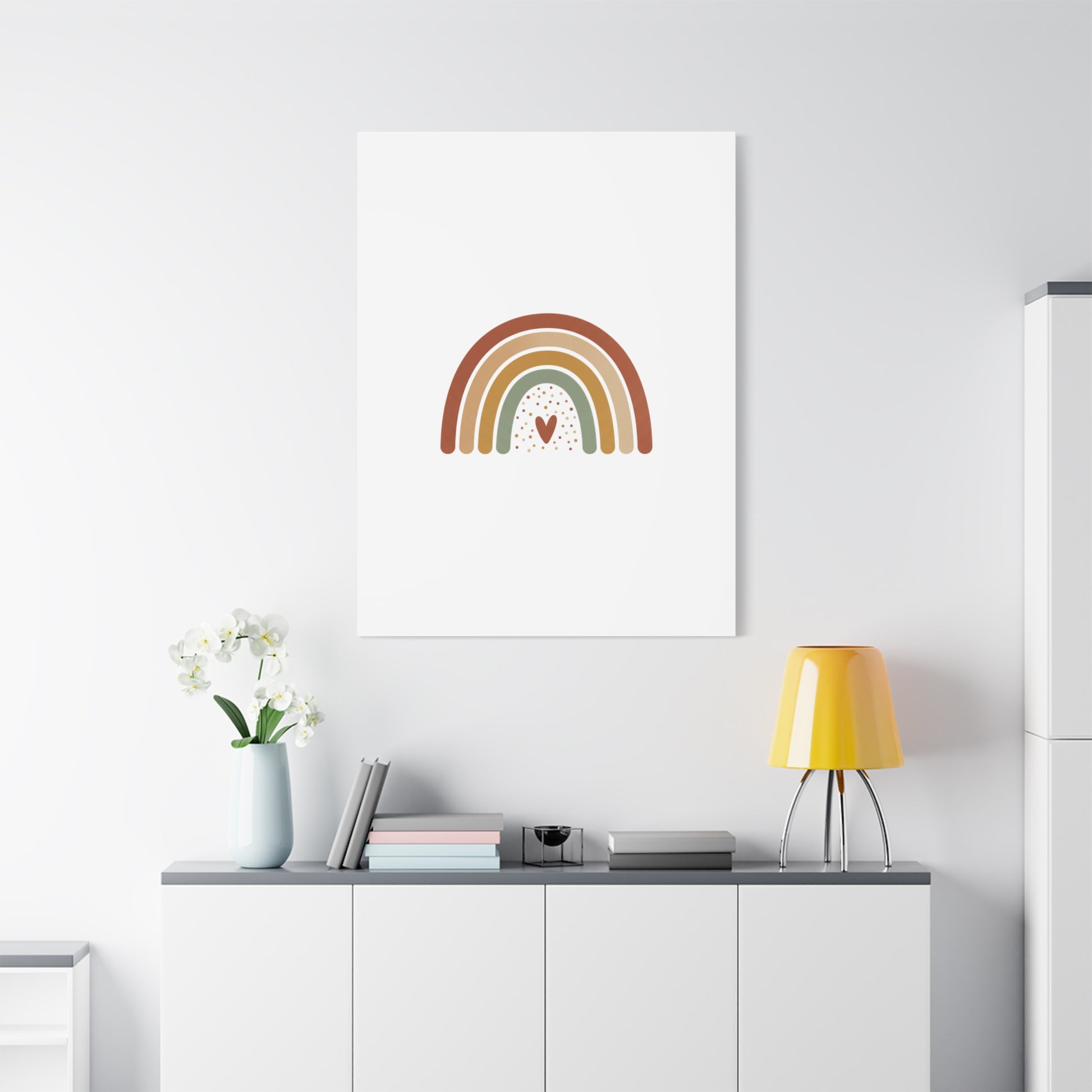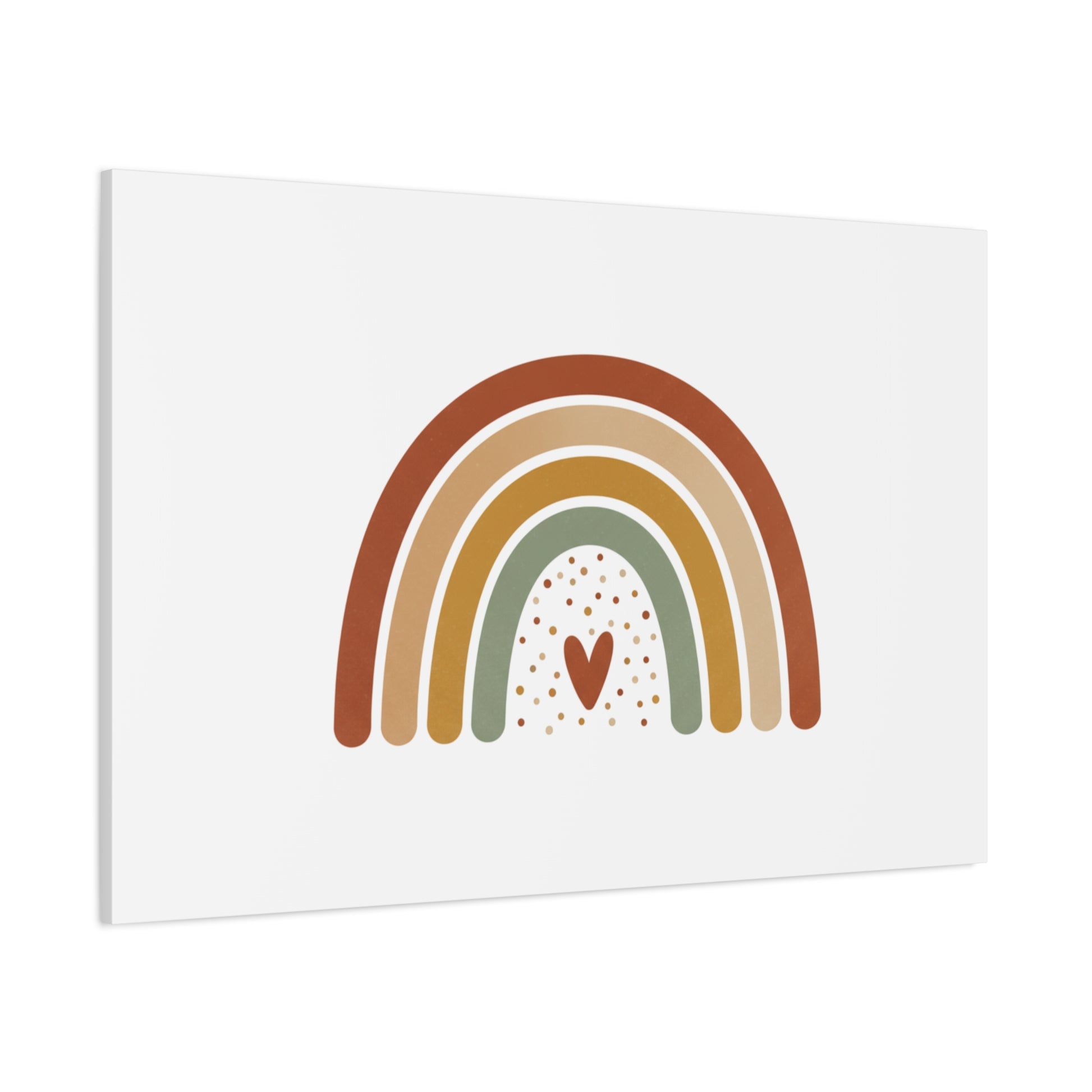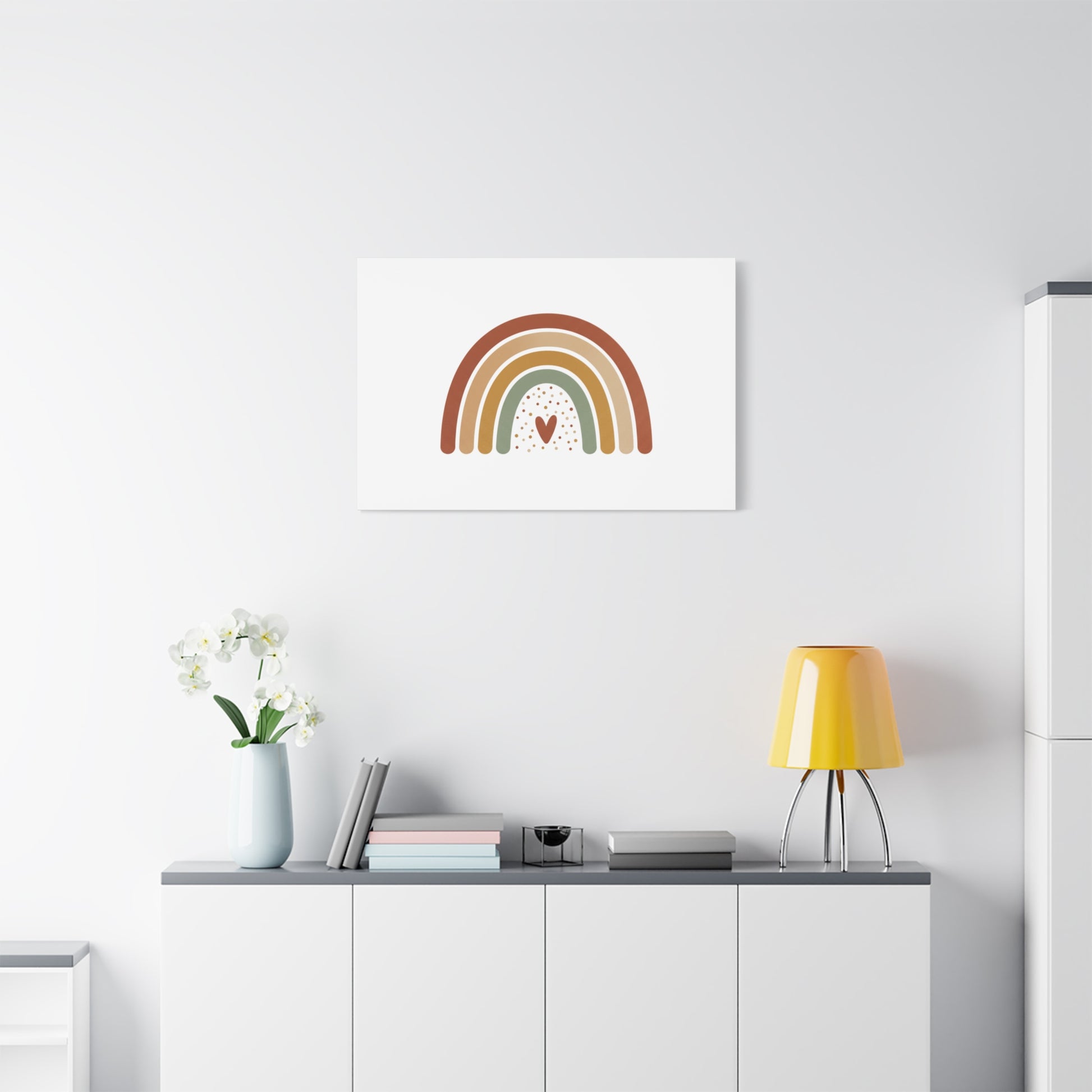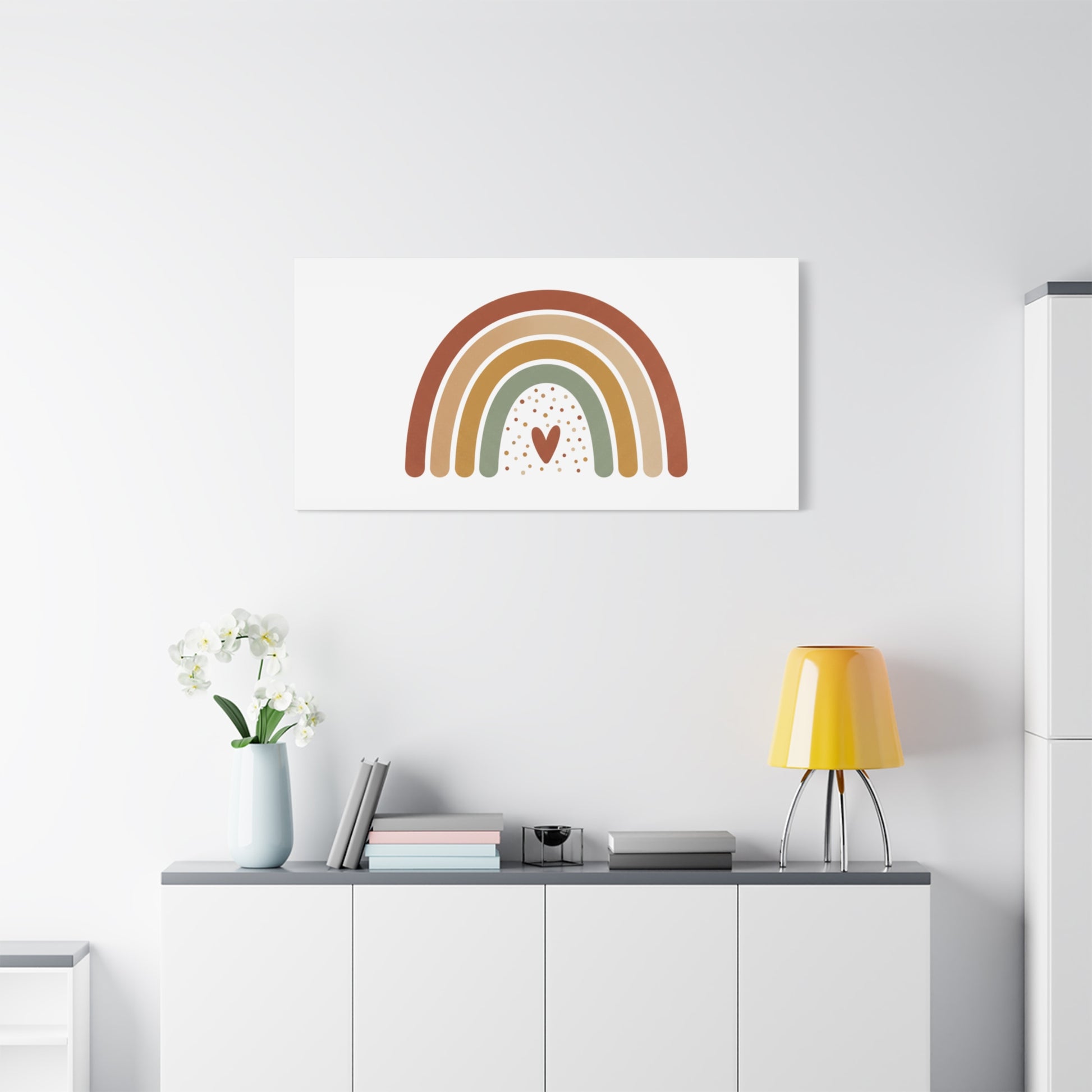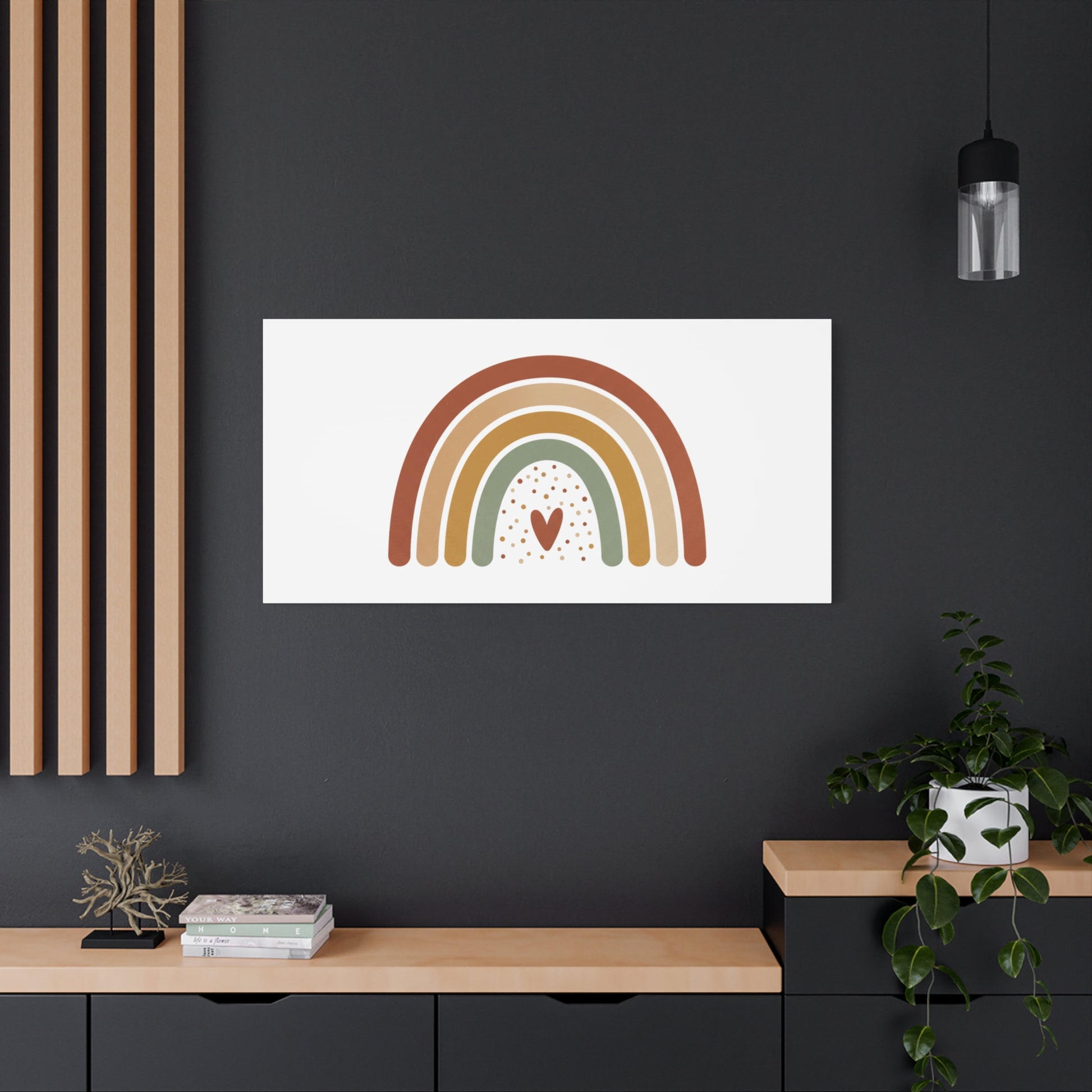 Muted boho rainbow on matte stretched canvas — gentle terracotta, sand, sage arcs encircle a tiny heart and freckled sprinkles for a calm, inclusive accent. The pared-back, earthy palette reads nursery-ready yet grown-up, bringing neutral rainbow warmth to pared-down, cozy interiors. Works as a soft focal point in minimalist living rooms, nurseries, or calming reading nooks where subtle, optimistic motifs fit the Neutral Rainbow trend.