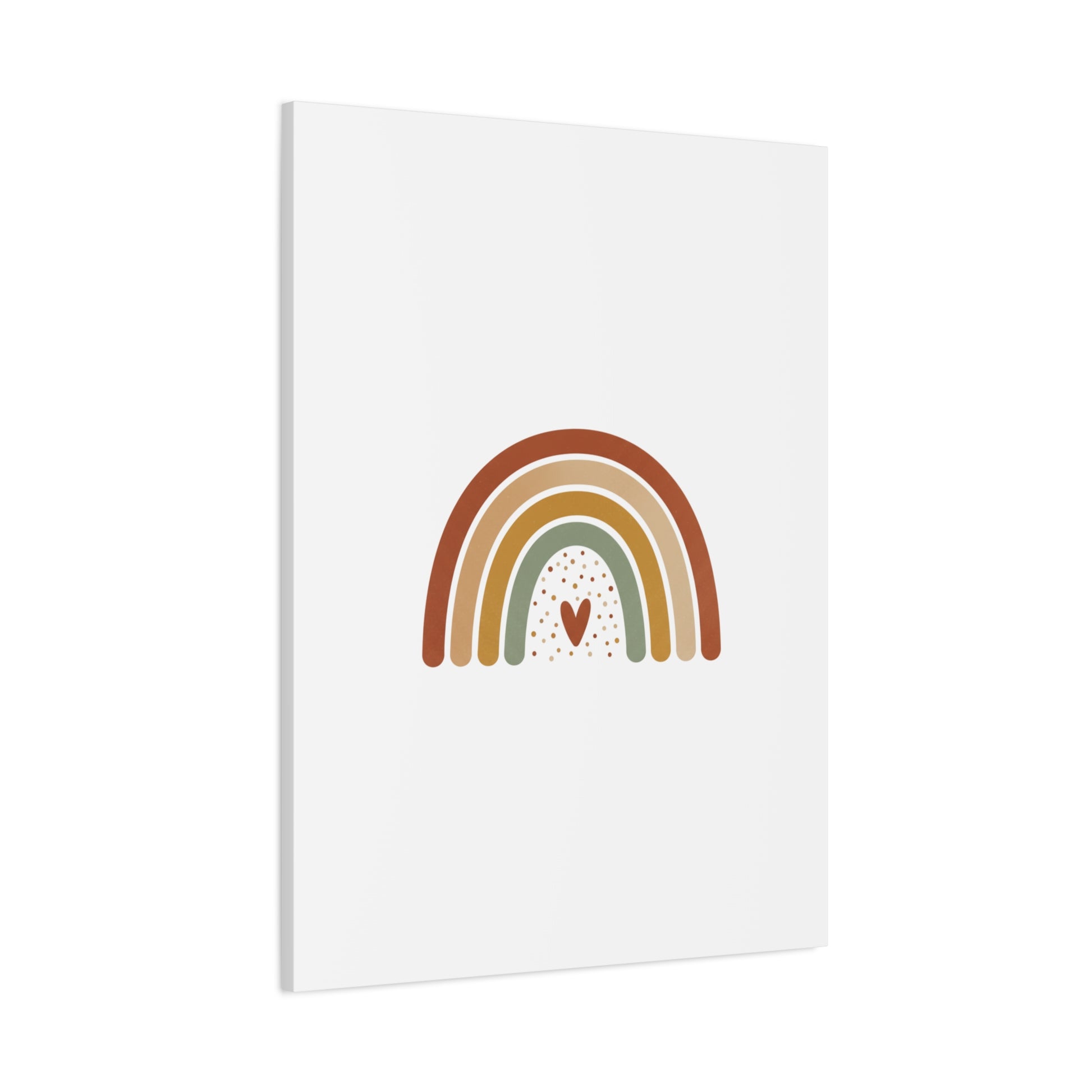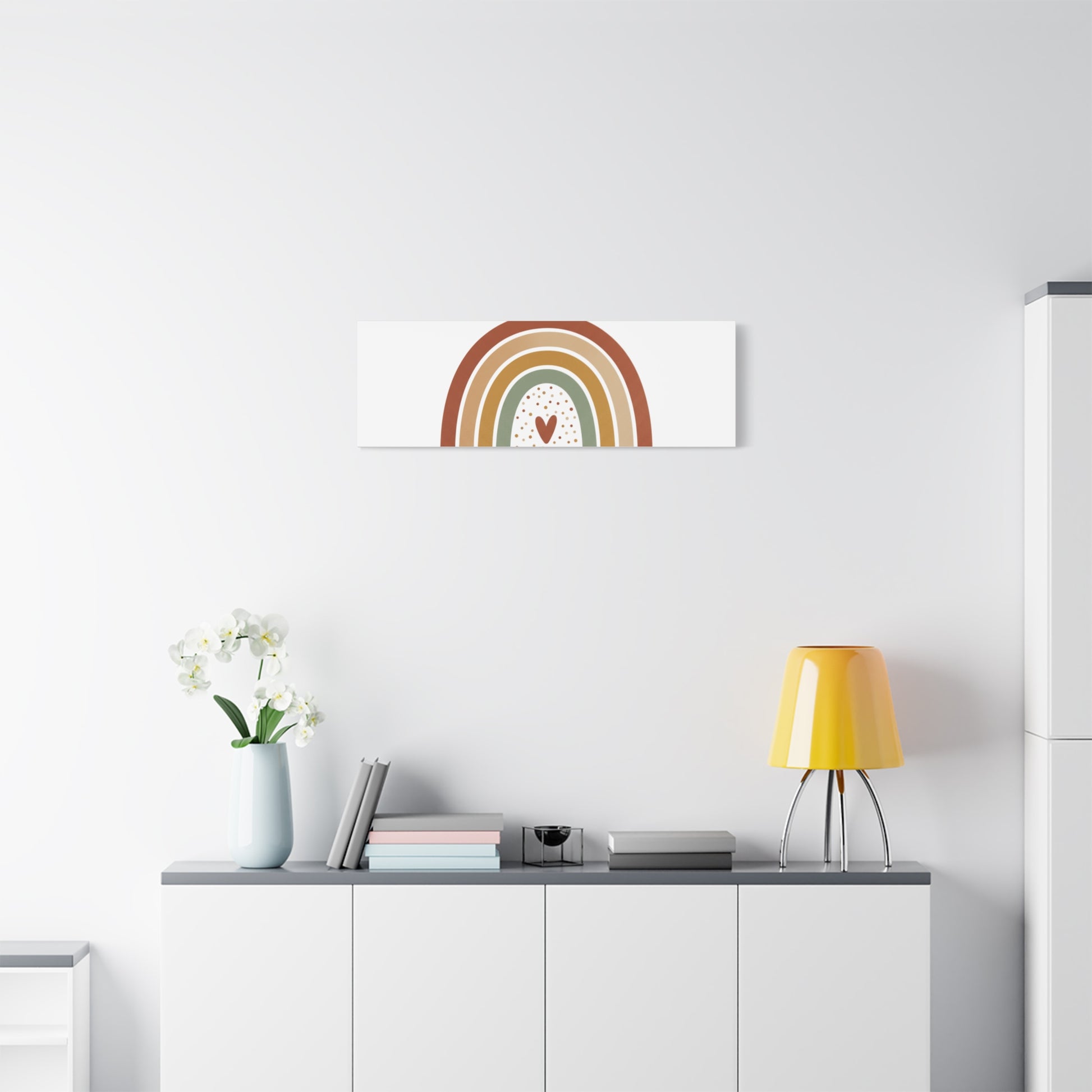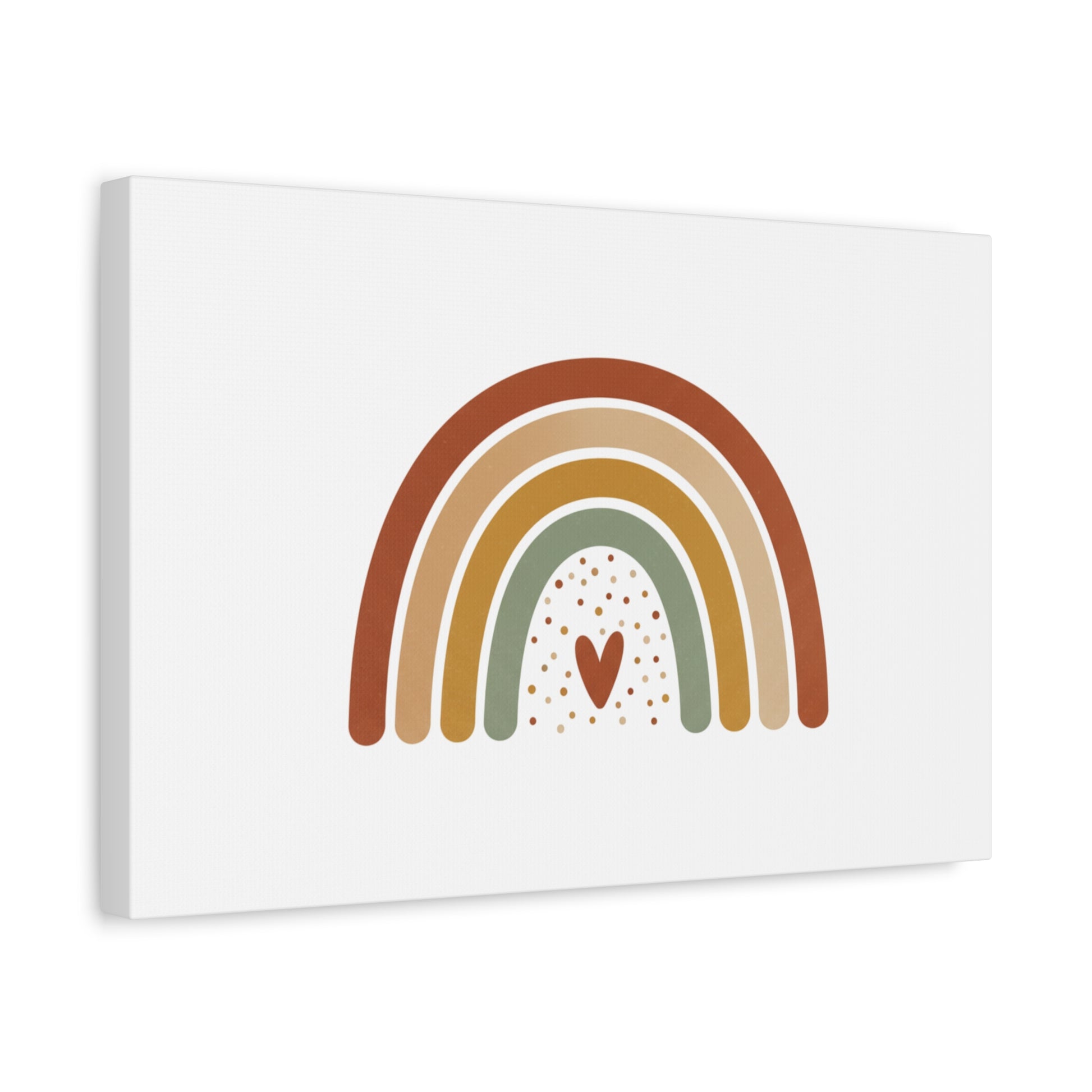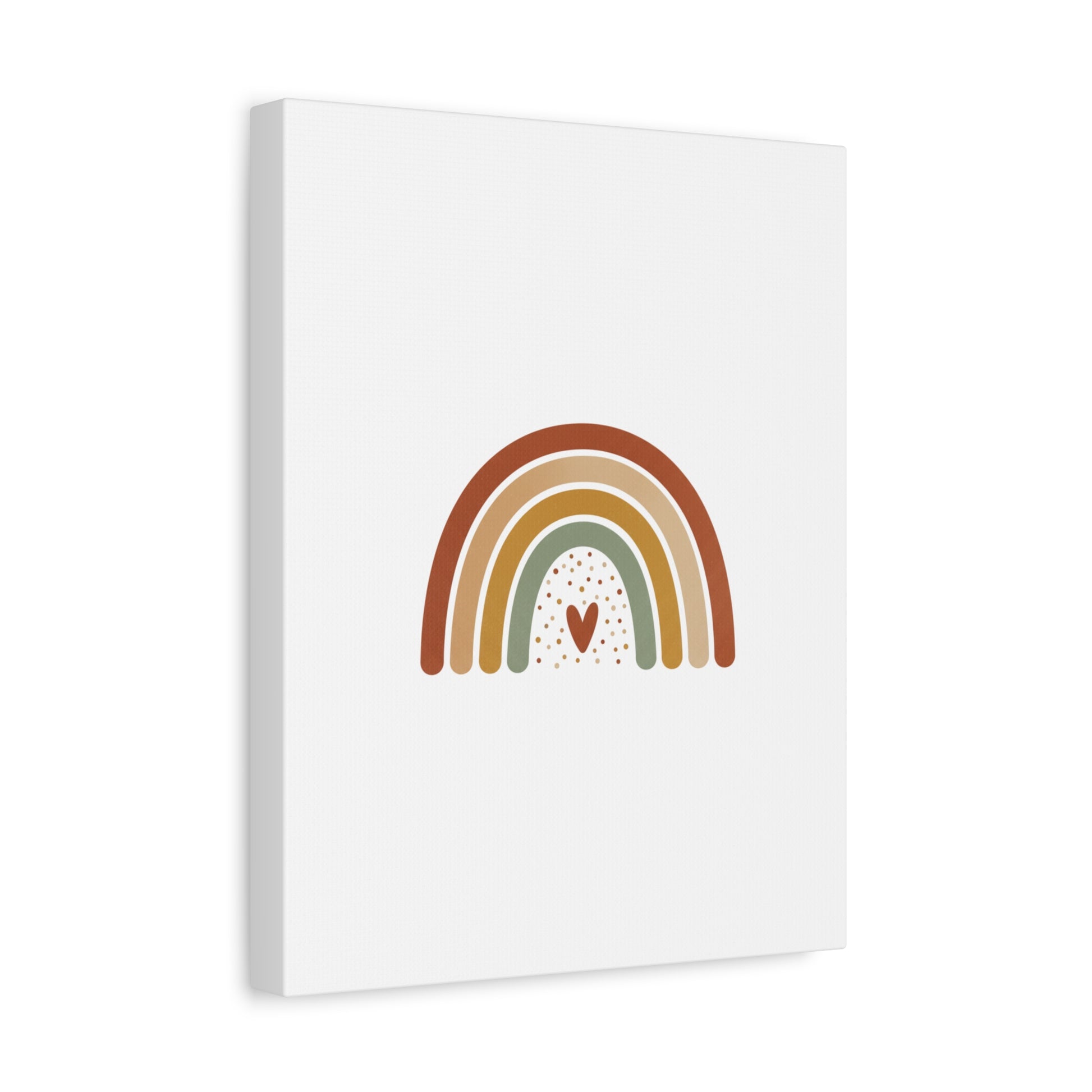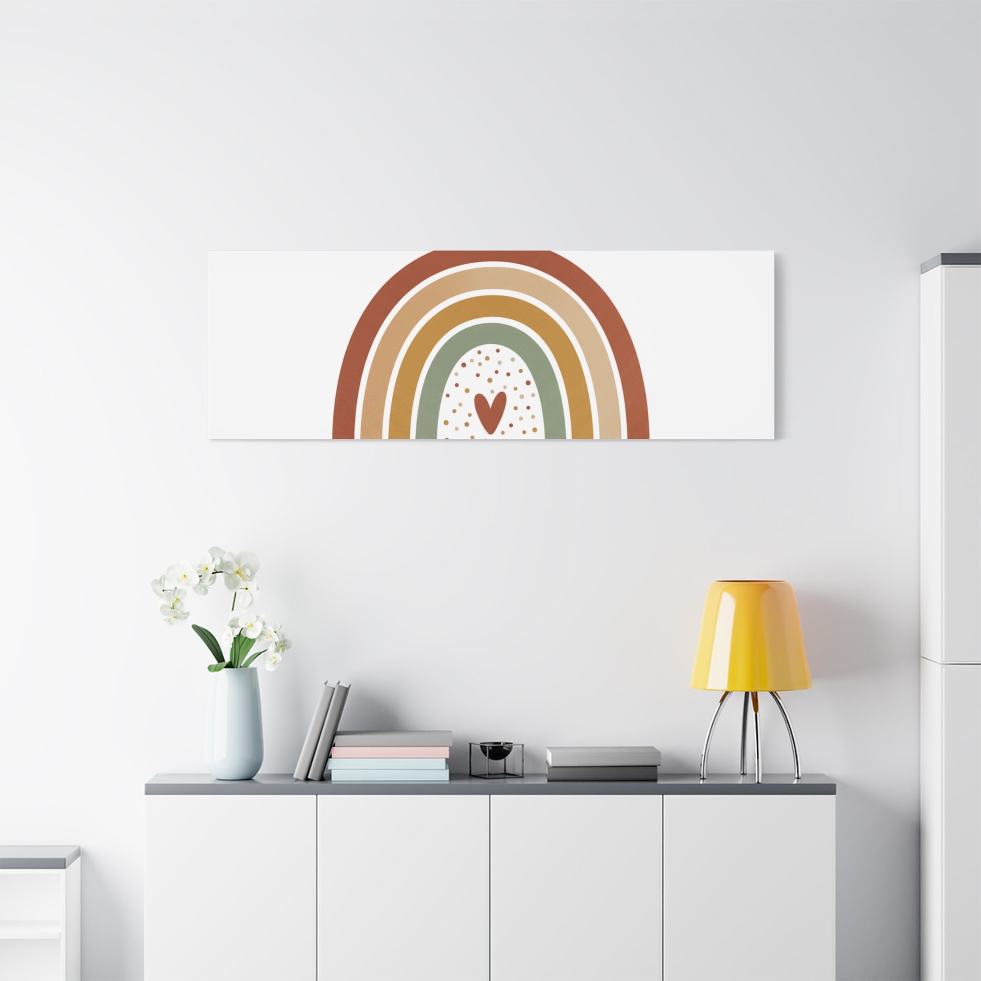 Muted boho rainbow on matte stretched canvas — gentle terracotta, sand, sage arcs encircle a tiny heart and freckled sprinkles for a calm, inclusive accent. The pared-back, earthy palette reads nursery-ready yet grown-up, bringing neutral rainbow warmth to pared-down, cozy interiors. Works as a soft focal point in minimalist living rooms, nurseries, or calming reading nooks where subtle, optimistic motifs fit the Neutral Rainbow trend.