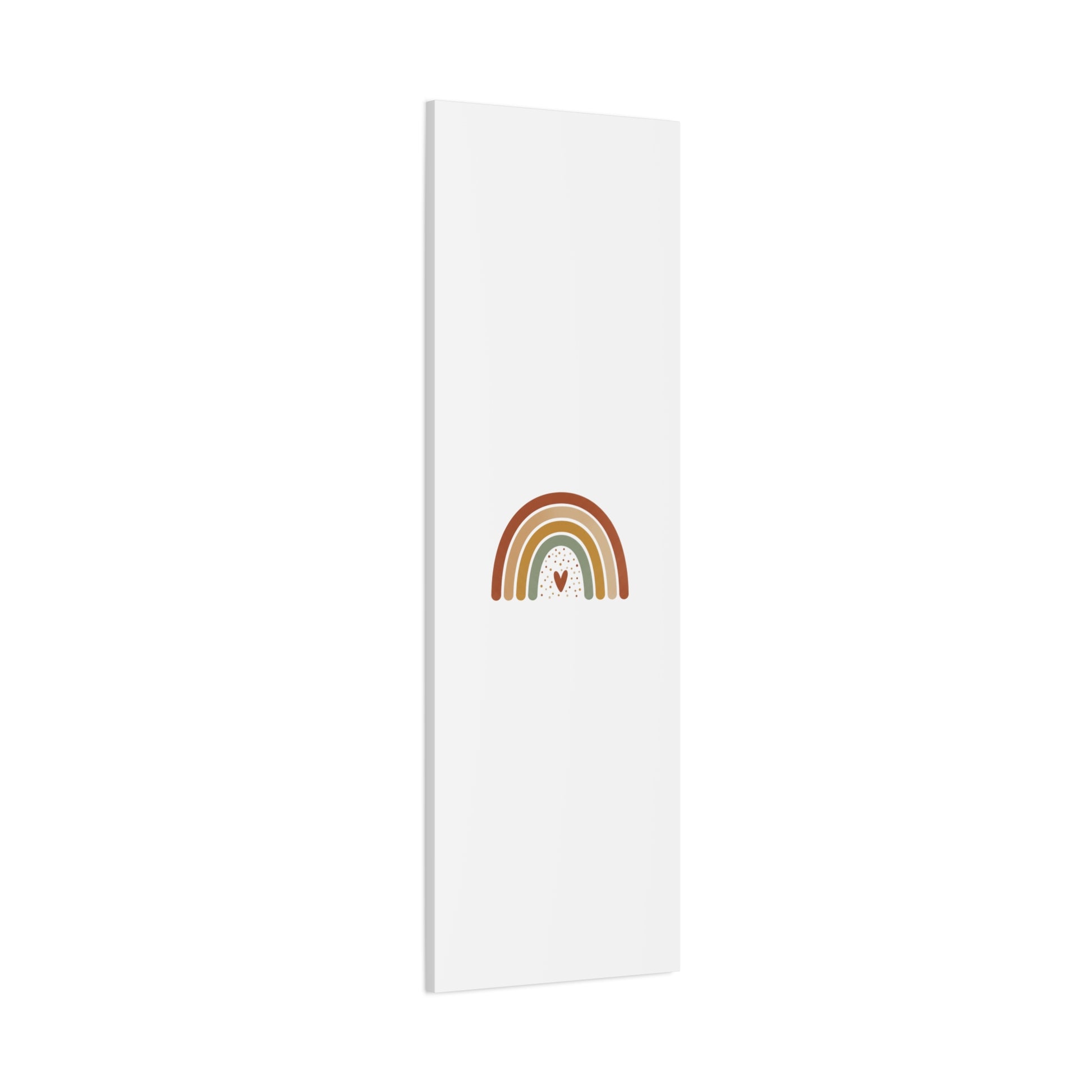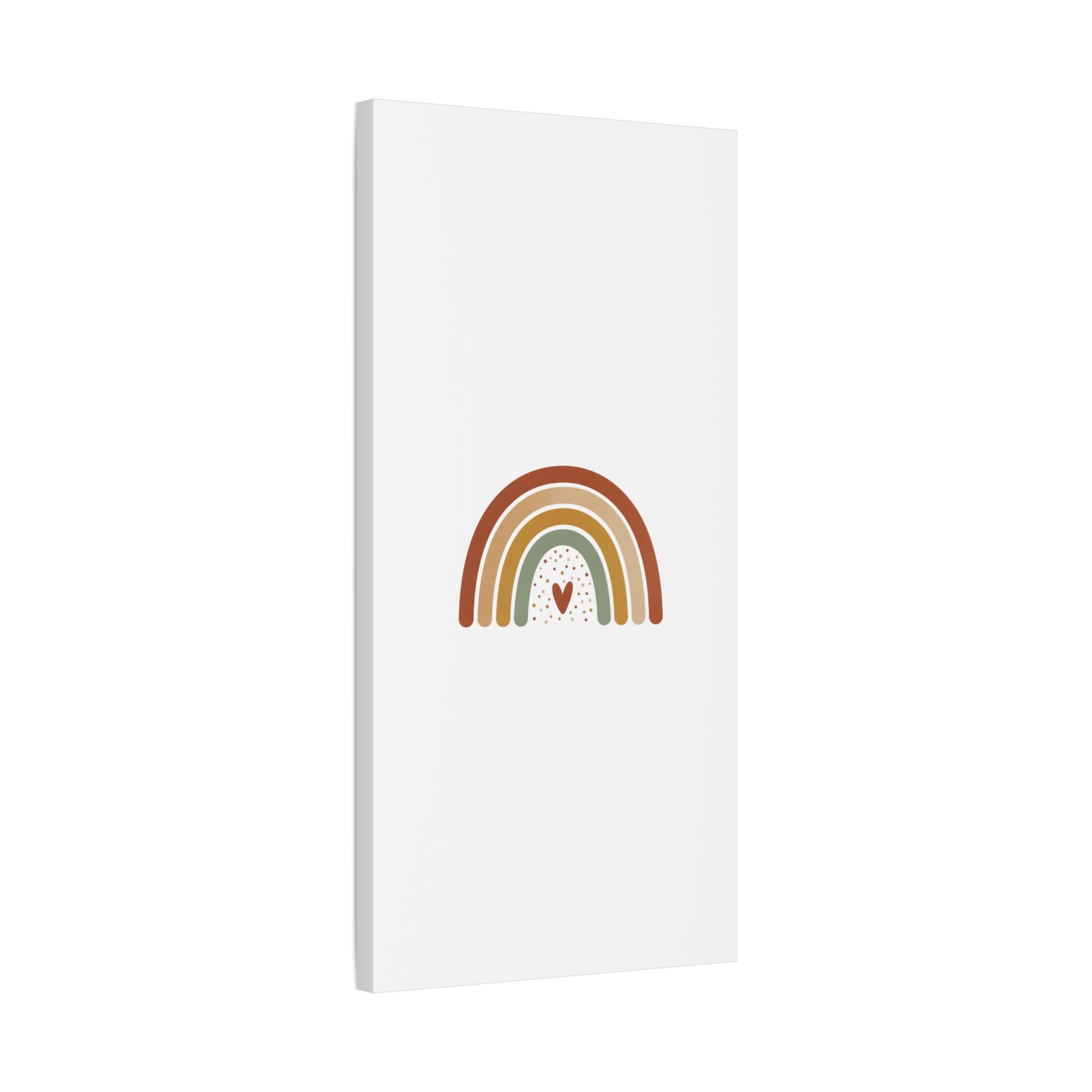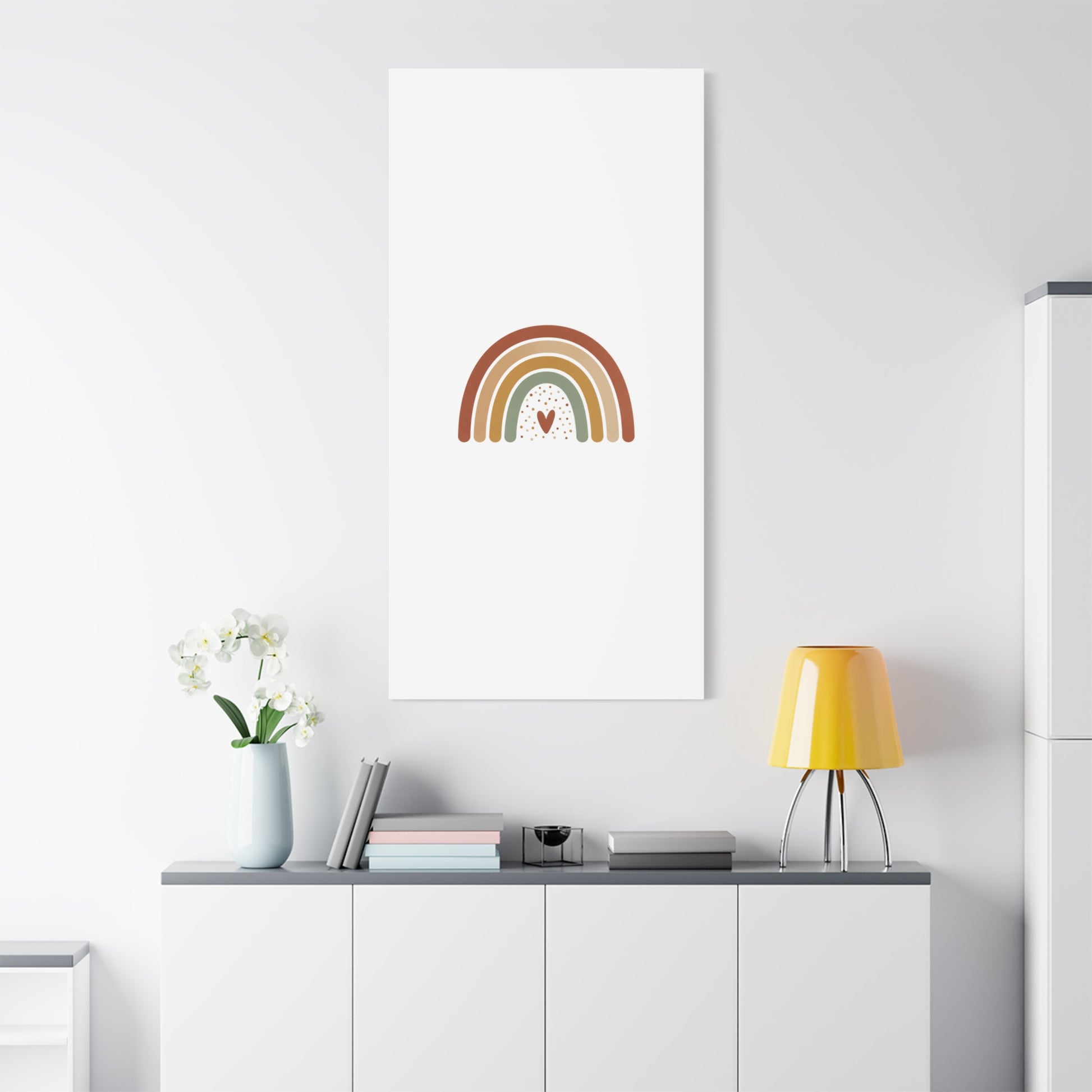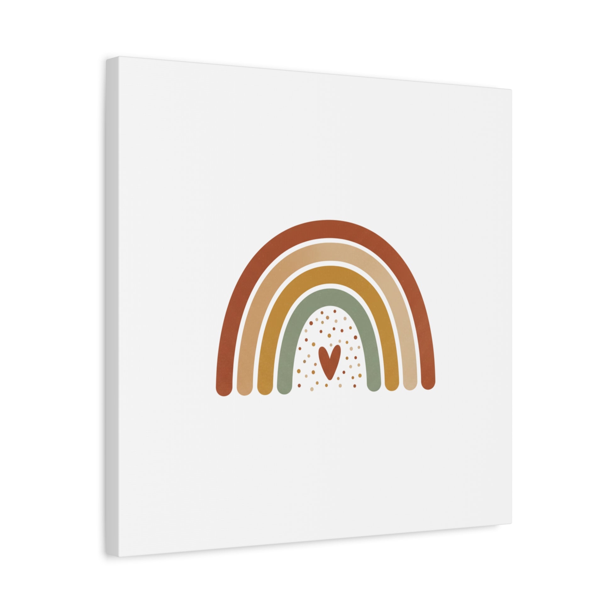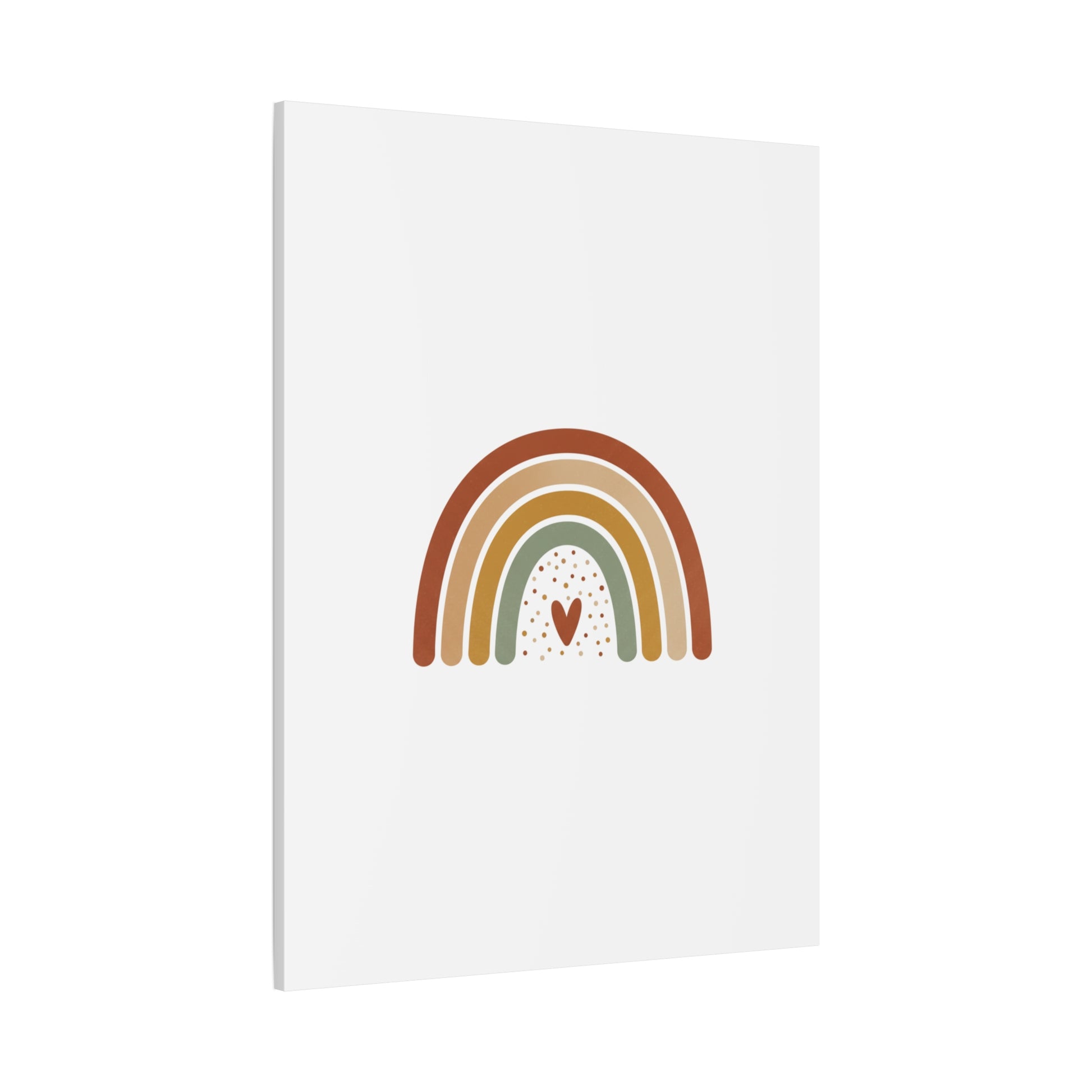 Muted boho rainbow on matte stretched canvas — gentle terracotta, sand, sage arcs encircle a tiny heart and freckled sprinkles for a calm, inclusive accent. The pared-back, earthy palette reads nursery-ready yet grown-up, bringing neutral rainbow warmth to pared-down, cozy interiors. Works as a soft focal point in minimalist living rooms, nurseries, or calming reading nooks where subtle, optimistic motifs fit the Neutral Rainbow trend.