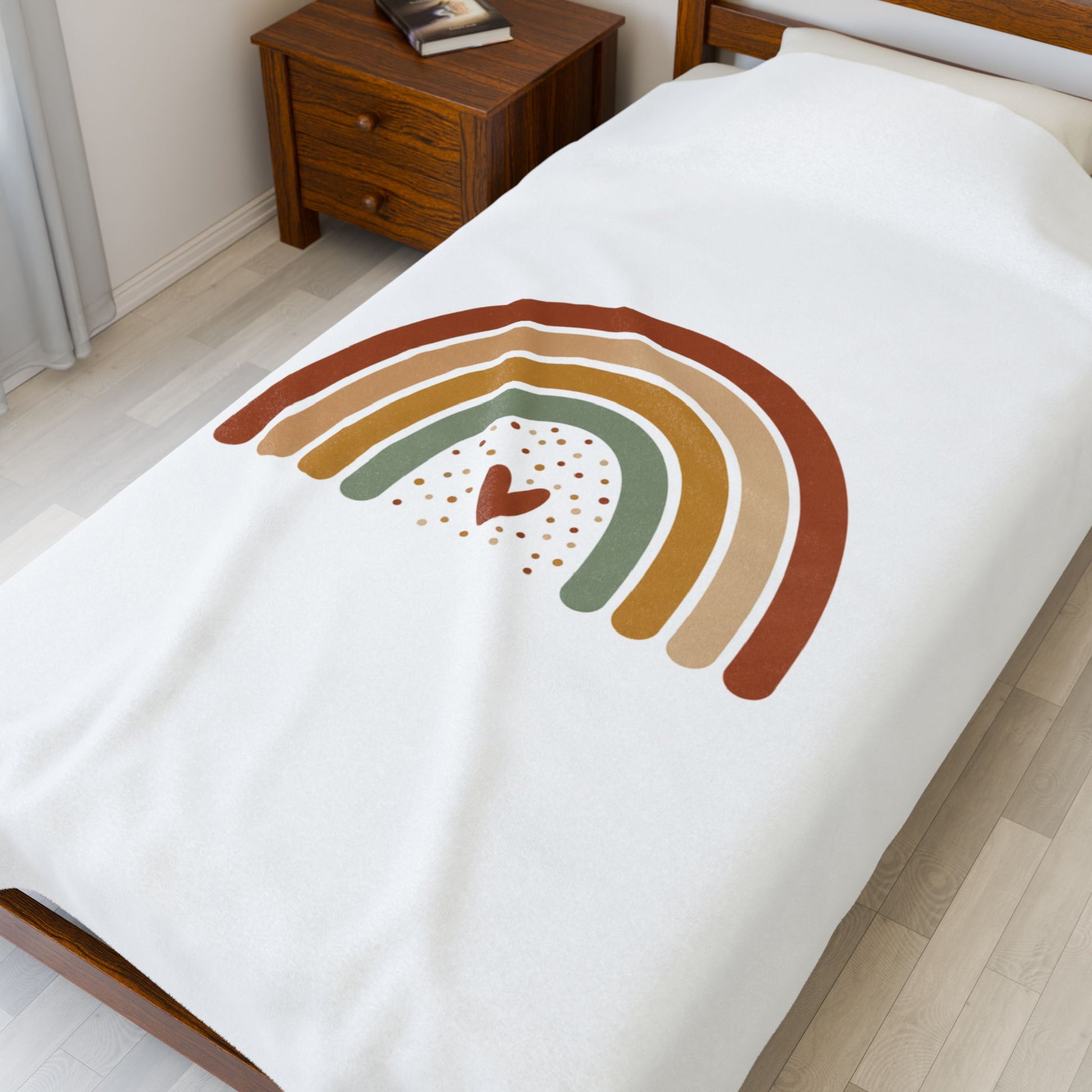 A soft, muted rainbow arc in terracotta, sage, sand and cream printed on a velveteen plush blanket — a calm boho accent that brings gentle optimism and tactile warmth to nurseries and minimalist living spaces. The simple hand-drawn arc and tiny heart create an approachable, inclusive mood aligned with the Neutral Rainbow trend, blending rustic earth tones and understated charm for everyday cozy moments.
